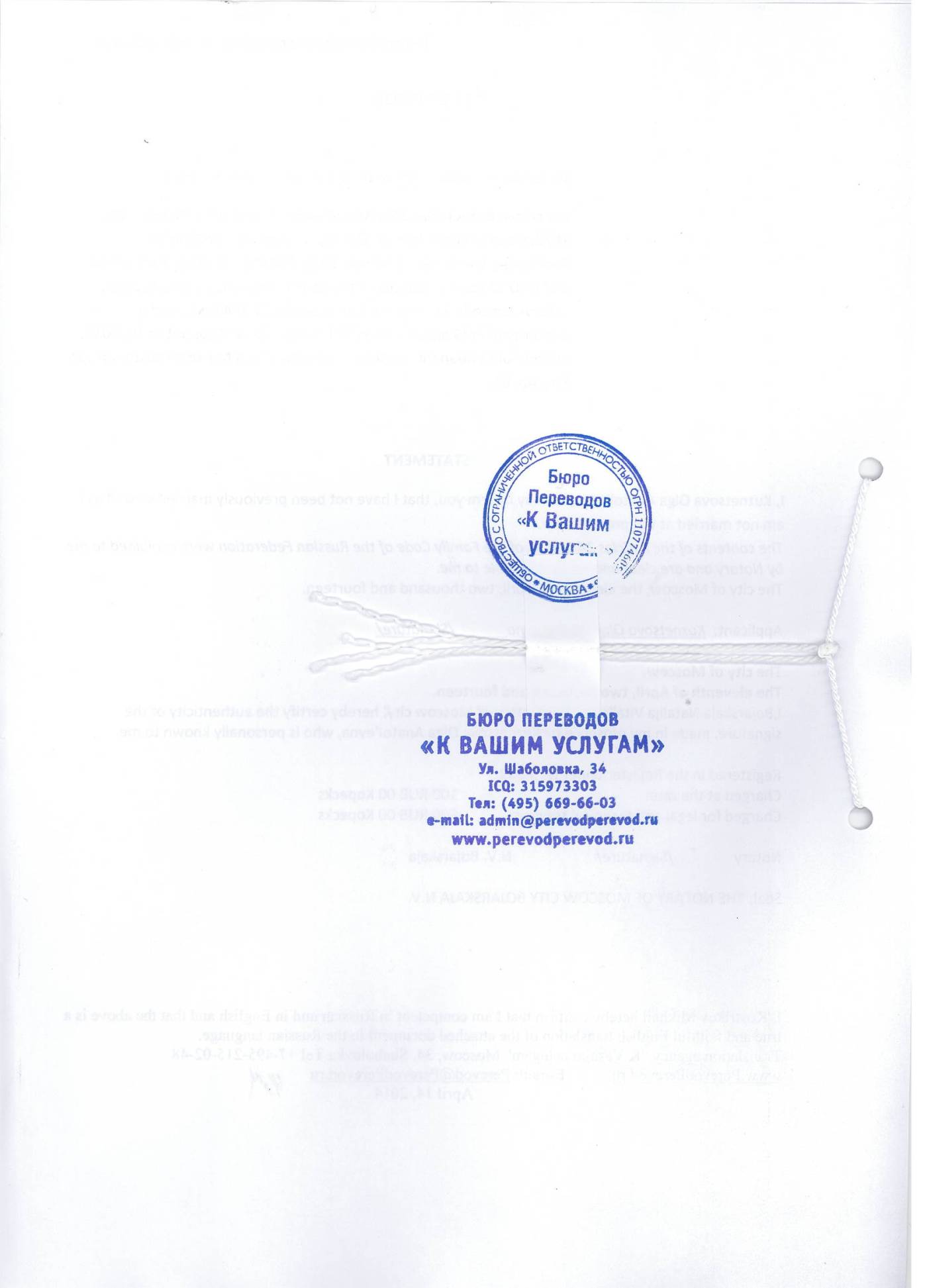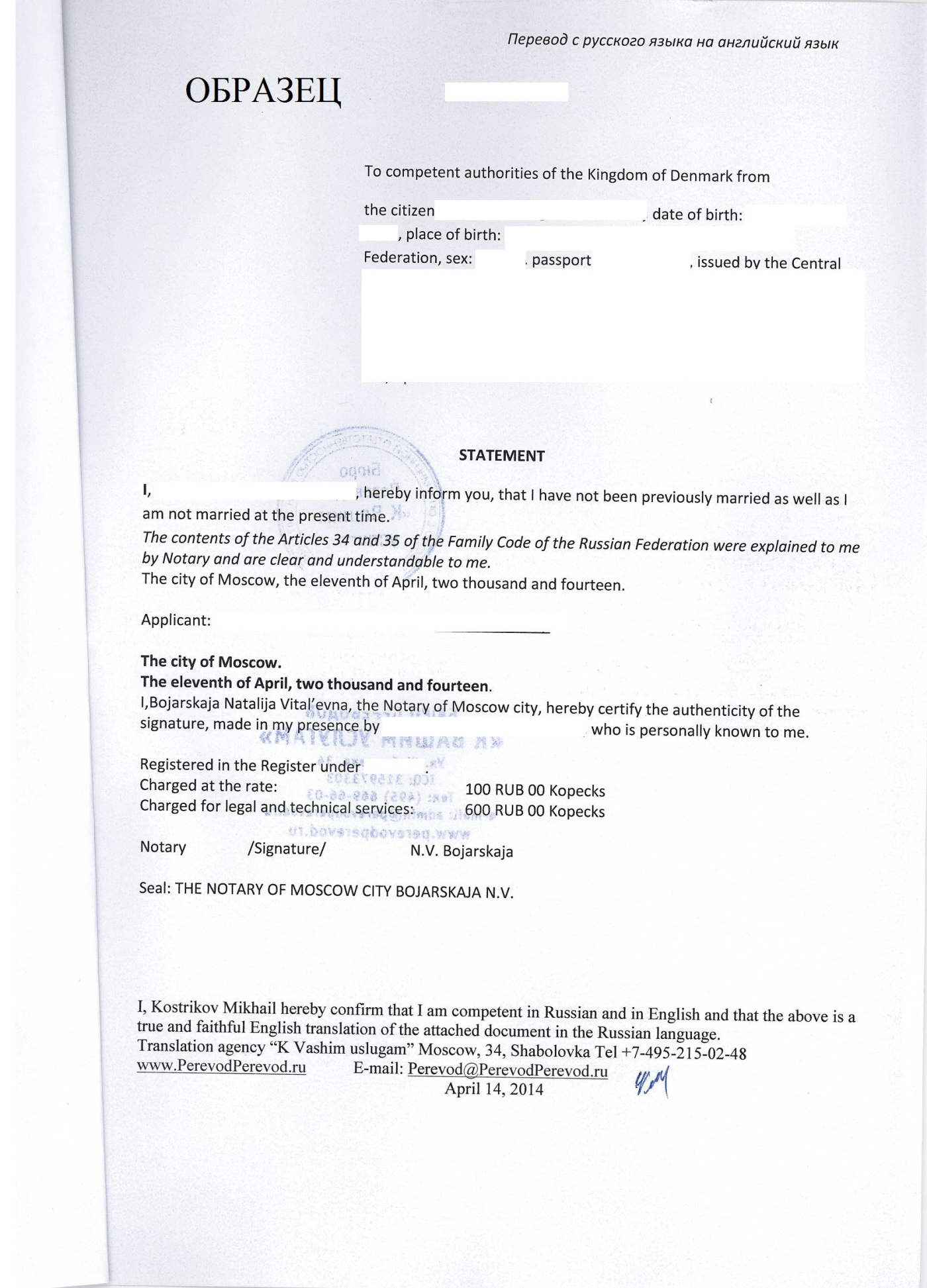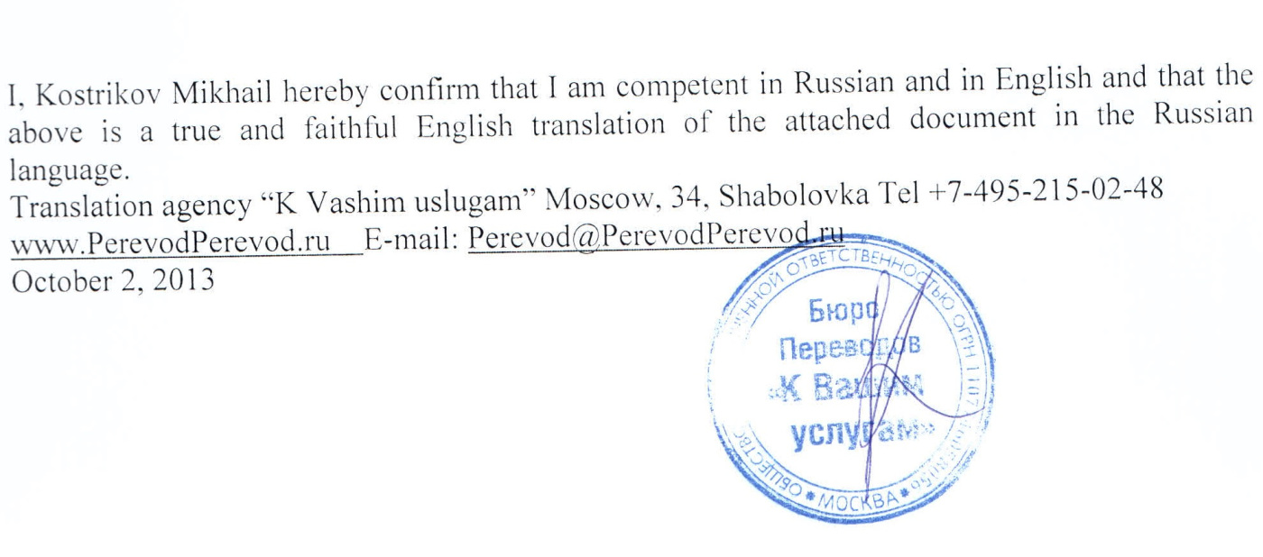 На всех переводах Ваших документов должна стоять печать организации или частного лица, выполняющего перевод и имеющей на это разрешение, реквизиты компании подпись и дата. Несколько страниц должны быть прошиты, пронумерованы и скреплены печатью. Ниже приведён образец правильного оформления переводов документов на немецкий язык и английский языки.